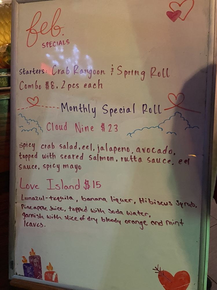 Shrimp tempura, spicy crab salad, lobster salad, mango & avocado, w/ rutta sauce, eel sauce & spicy mayo